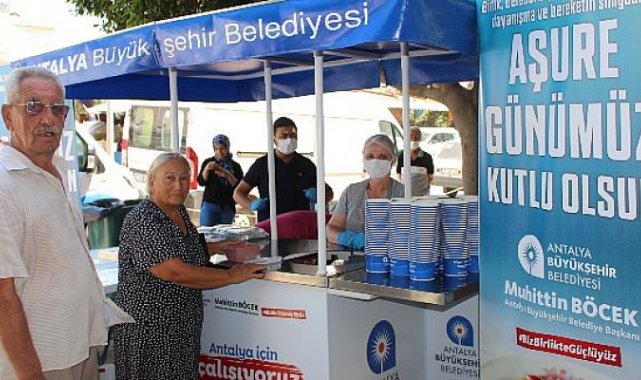 Antalya Büyükşehir Belediyesi Sosyal Hizmetler Daire Başkanlığı birlik, beraberlik, kardeşlik, paylaşma, dayanışma ve bereketin simgesi aşure ikramlarına devam ediyor. Muharrem Ayı boyunca 40 bin kişiye aşure dağıtacak olan Büyükşehir Belediyesi ekipleri Finike, Kaş, Gazipaşa ve Kemerli vatandaşlara ikramda bulundu.