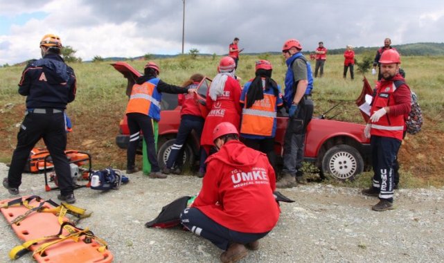 Bilecik'in Pazaryeri ilçesinde UMKE tarafından gerçekleştirilen tatbikat gerçek kurtarma operasyonunu aratmadı.Pazaryeri Gündem / BİLECİK (İGFA) - Bilecik'in Pazaryeri ilçesinde Küçükelmalı Tabiat Parkı'nda UMKE tarafından 2022 UMKE faaliyet planı kapsamında düzenlenen 3 günlük eğitim kampı sonrası ekipler gerçeği aratmayan bir tatbikat gerçekleştirdi.Senaryo gereği zincirleme kazası için 112 Acil Servis Ekiplerine ihbar ile bölgeye ulaşan UMKE ve AFAD ekipleri araçta sıkışan sürücü ve vatandaşlar için seferber oldu.Ekipler araçlarda sıkışan yaralı vatandaşları sıkıştığı araçtan çıkartarak ambulanslarla hastaneye sevk etti.UMKE tarafından gerçekleştirilen tatbikata Bilecik İl Jandarma ve AFAD ekipleri de katıldı.