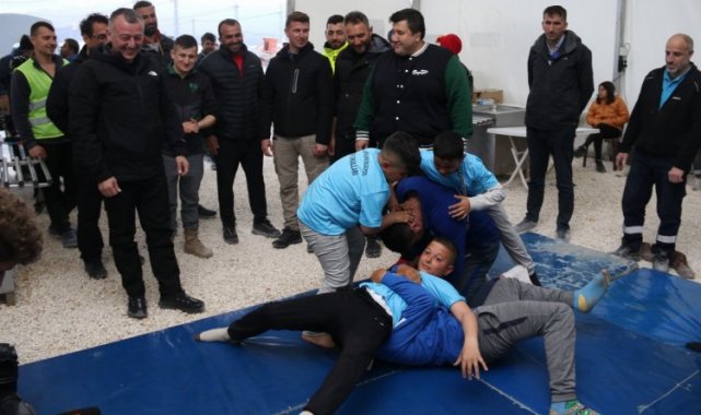 Kocaeli Büyükşehir Belediyesi'nin Defne’deki çadır kentinde depremzede çocuklarla mindere çıkarak güreş tutan başpehlivanlar, çocukların keyifli anlar geçirmesini sağladı