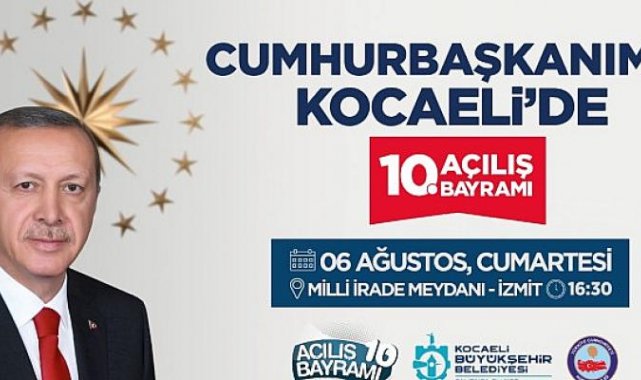 Kocaeli’de 10. Açılış Bayramı, 6 Ağustos Cumartesi günü Cumhurbaşkanımız Recep Tayyip Erdoğan’ın katılımıyla İzmit Milli İrade Meydanında saat 16.30’da yapılacak. Kocaeli Büyükşehir Belediye Başkanı Tahir Büyükakın, ‘’Bu eserler Kocaeli’nin, bu eserler hepimizin. Hayata geçen eserlerde 7’den 70’e bu kentte yaşayan herkesin payı var, emeği var, katkısı ve desteği var. Gelin bu mutluluğa, bu gurura, bu heyecana siz de katılın’’ sözleriyle 10. Açılış Bayramı’na tüm Kocaeli halkını davet etti.