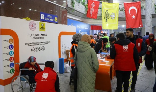 Konya Büyükşehir Belediyesi, Konya Şehirlerarası Otobüs Terminali’nde sağlık kabini, afet koordinasyon masası, turuncu masa ile depremzede vatandaşlara 24 saat destek oluyor.