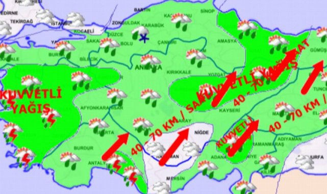 KUVVETLİ YAĞIŞ UYARISI: Yağışların Marmara'nın güney ve doğusu, Ege, Batı Akdeniz, Orta Karadeniz kıyıları, Adana'nın kuzey ve doğusu, Osmaniye, Hatay, Kahramanmaraş, Eskişehir, Ankara'nın kuzey ve batısı, Düzce, Zonguldak, Bolu, Karabük, Kırşehir, Nevşehir, Sivas ve Tokat çevrelerinde yer yer kuvvetli sağanak, akşam saatlerinden sonra yer yer kuvvetli kar yağışı beklendiğinden yaşanabilecek ani sel, su baskını, yıldırım, yerel dolu yağışı ve kuvvetli rüzgar, ulaşımda aksamalar gibi olumsuzluklara karşı dikkatli ve tedbirli olunması gerekmektedir.