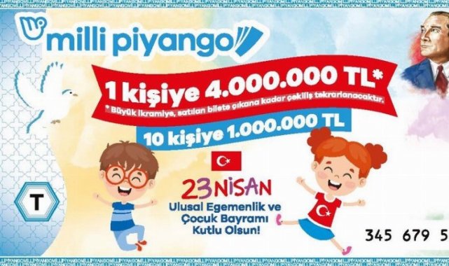 Milli Piyango 23 Nisan özel çekilişinde bir kişi 4 milyon TL kazanacak. Büyük ikramiye satılan bilete çıkana kadar çekiliş tekrarlanacak. İSTANBUL (İGFA)- Milli Piyango 23 Nisan biletleri satışa sunuldu. Bilet fiyatları tam 30 TL, yarım 15 TL ve çeyrek bilet 7,5 TL olarak belirlendi. Birinci kategoride büyük ikramiye 4 milyon TL iken, İkinci kategori çekilişinde ise 10 kişiye 1 milyon TL verilecek.Oyunseverler, 23 Nisan biletlerini gezici bayi ve sabit bayilerin yanı sıra online olarak www.millipiyangoonline.com adresinden, Milli Piyango Şans Oyunları uygulamasından ve sabit bayilerdeki oyun terminallerinden dijital bilet olarak alabilecek.